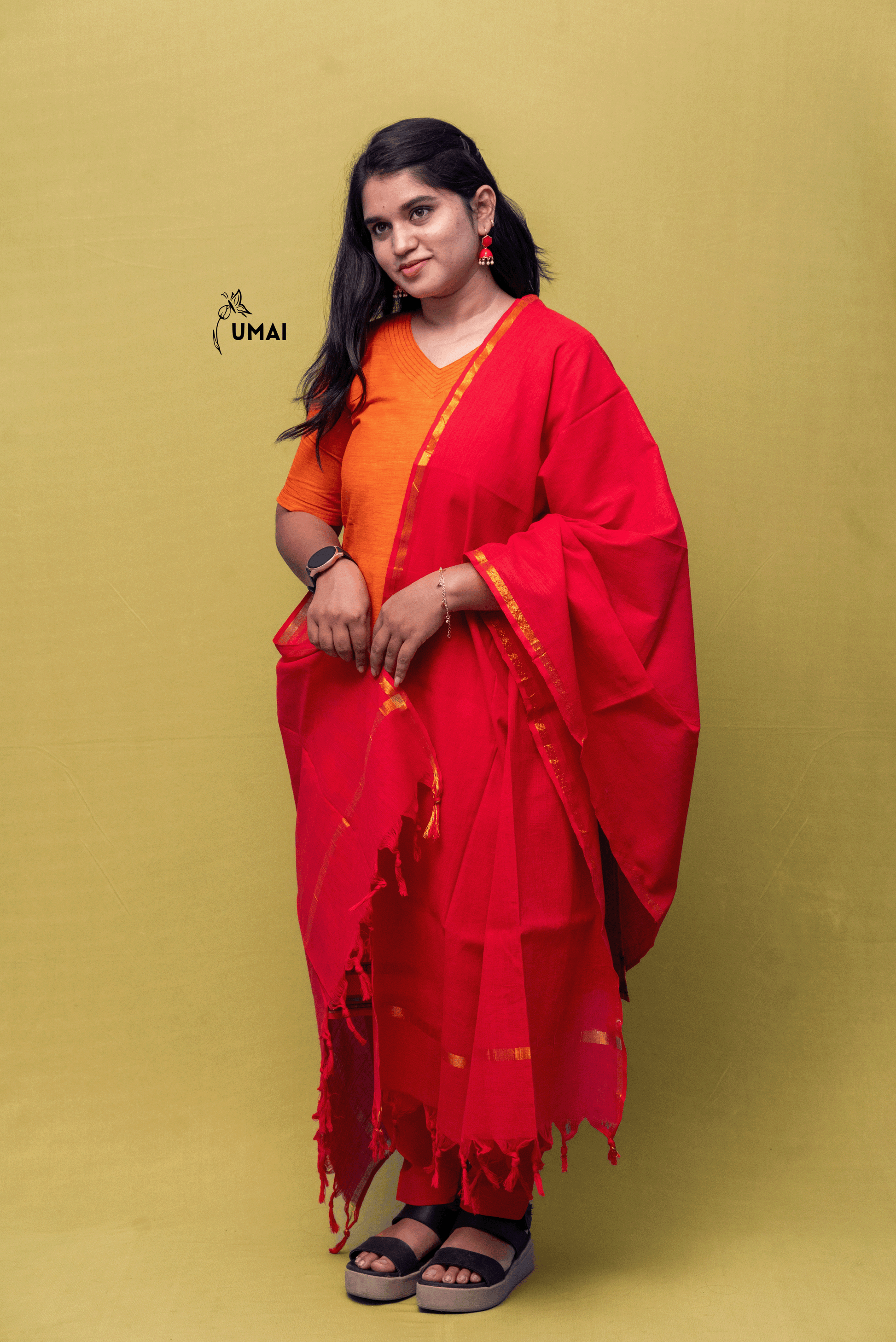 A confident smile paired with a vibrant orange salwar, radiating positivity and elegance. The simple yet graceful look is completed with matching earrings and subtle accessories🧡
