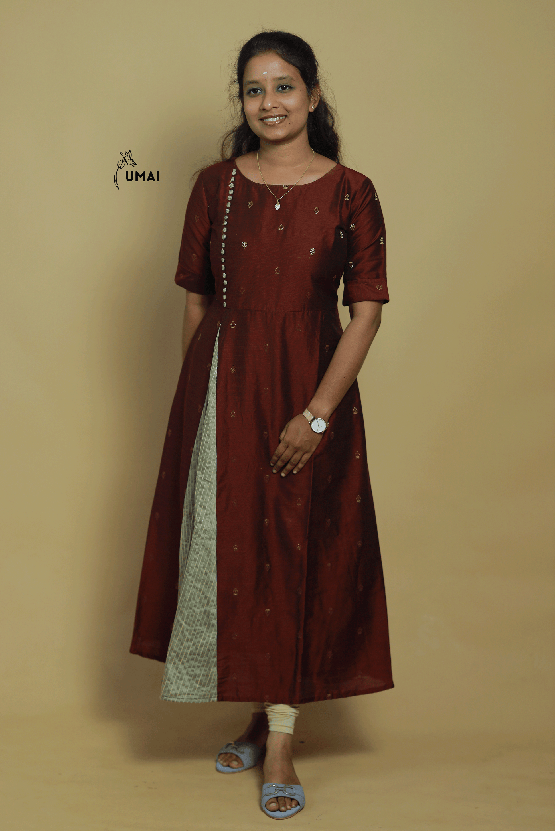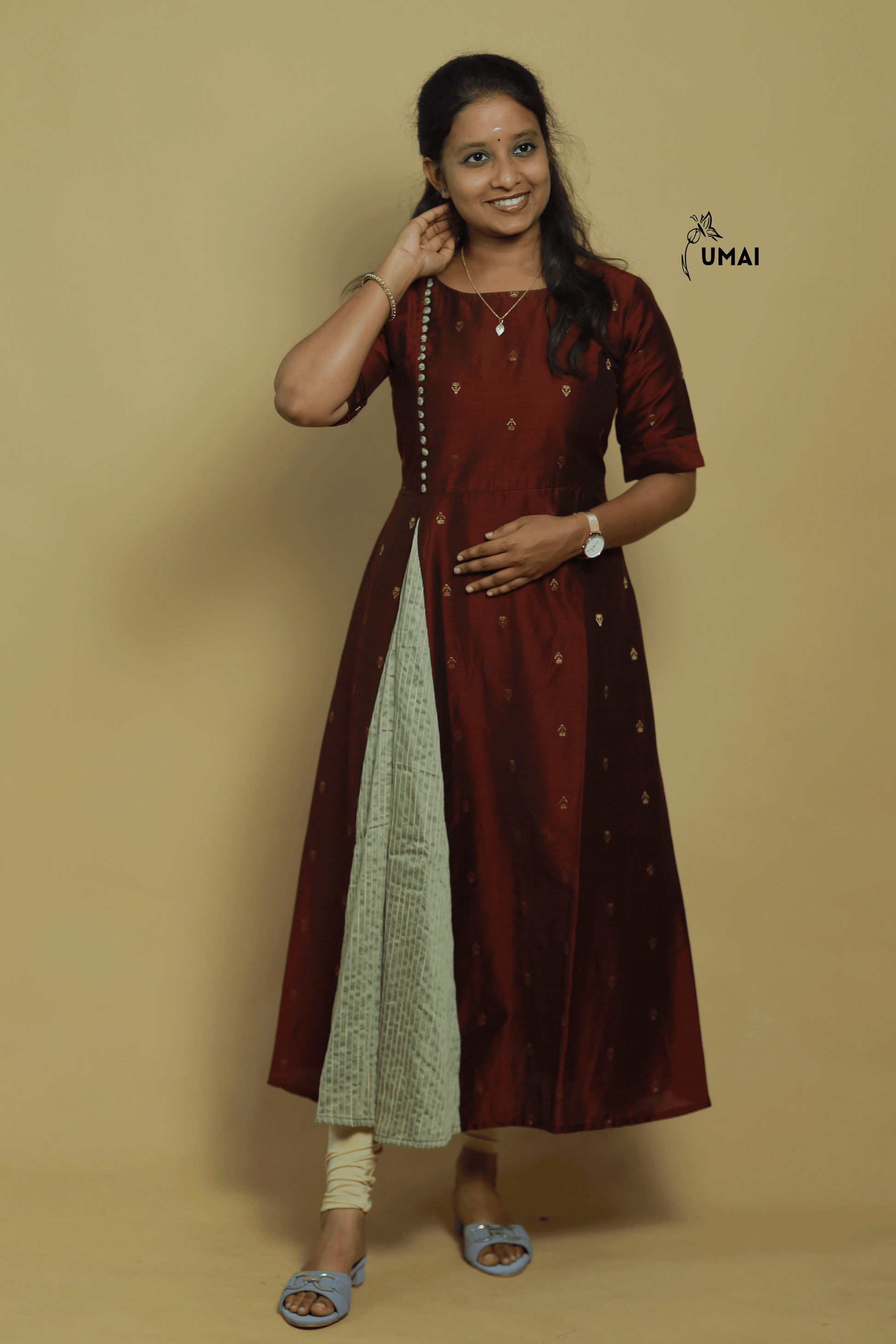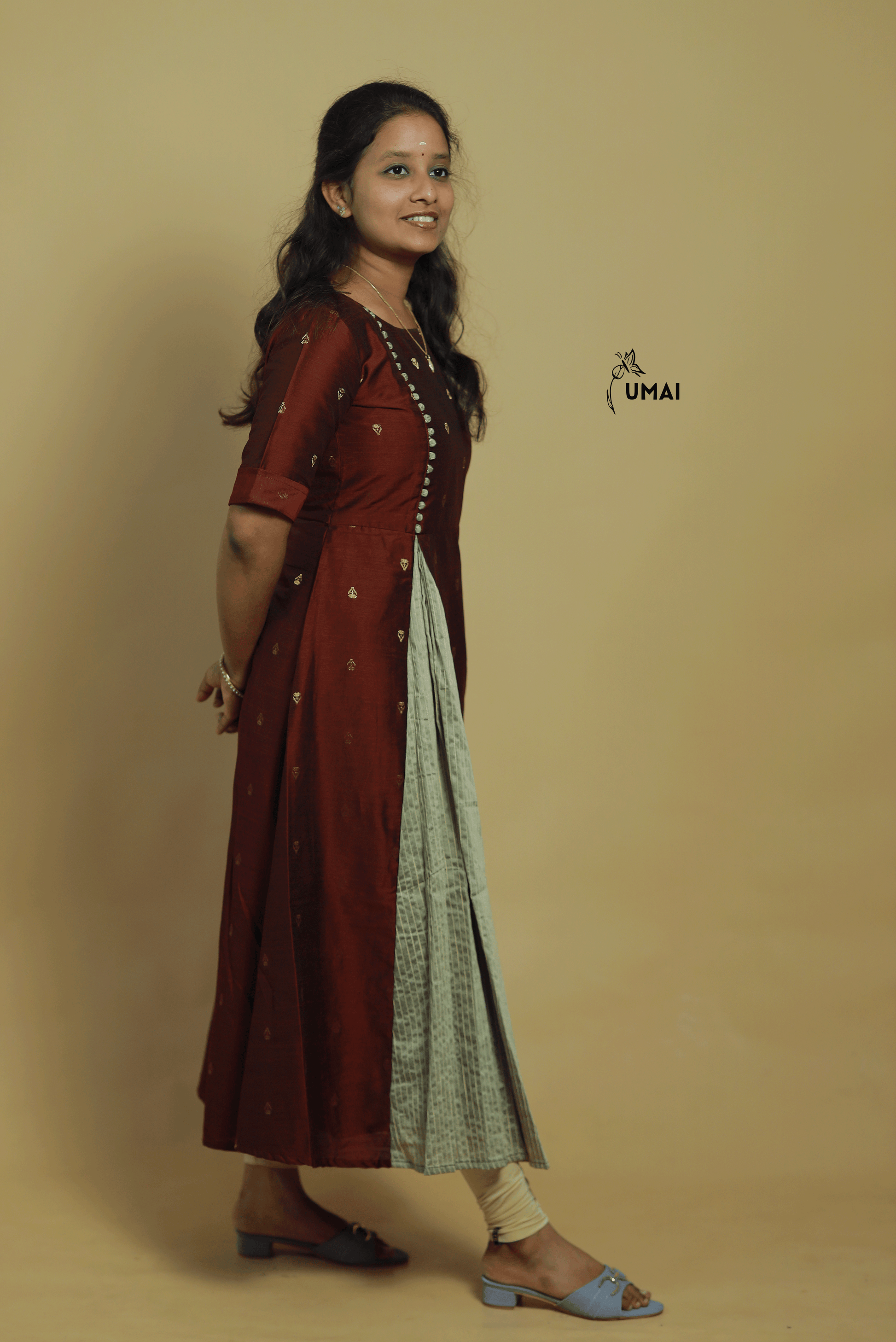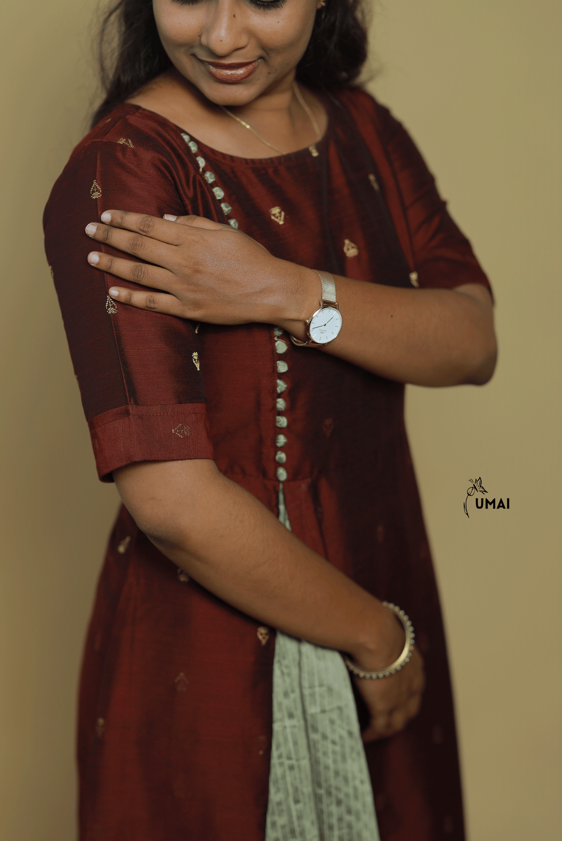 Step into elegance with our Wine Glow Gown, a stunning fusion of tradition and modern charm. The deep wine shade beautifully complements the golden pleated flare, creating a rich festive vibe. Designed with intricate golden motifs and front button detailing, this outfit is perfect for festive nights or graceful gatherings. Shine effortlessly in every twirl! ✨❣️